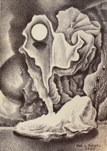 A 4 boyutunda karton üzerine sürrealist bir siyah tükenmez kalemle çizim, 2025.