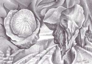Sanatsal anlayış ve üslup olarak sürrealizm: bu çizimde bilinçdışı imgeler, gerçeküstü mekânlar ve hayal gücünü zorlayan formlar ile dikkat çeker. Salvador Dalí ya da Max Ernst gibi sanatçılarda da gördüğümüz, gerçekliğin çarpıtılması söz konusu.